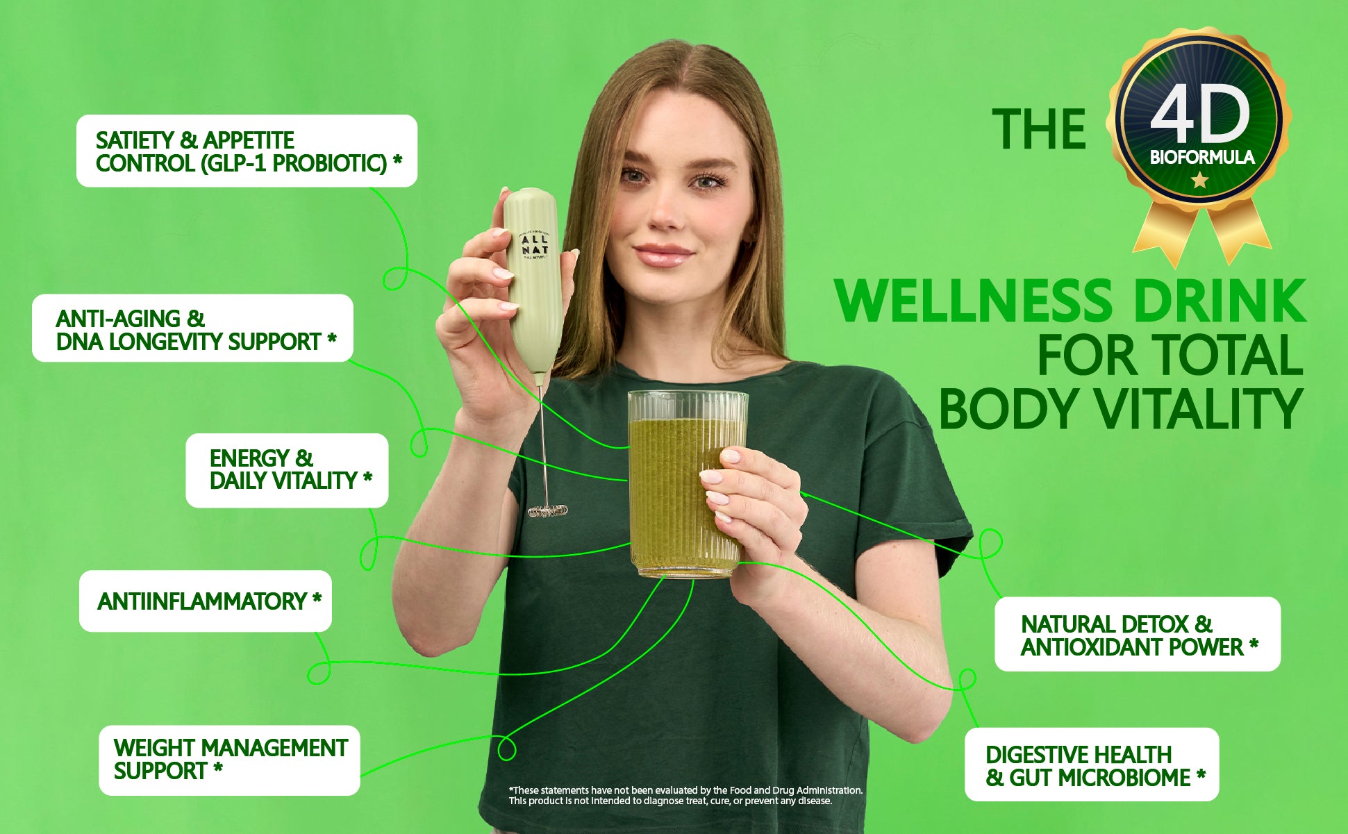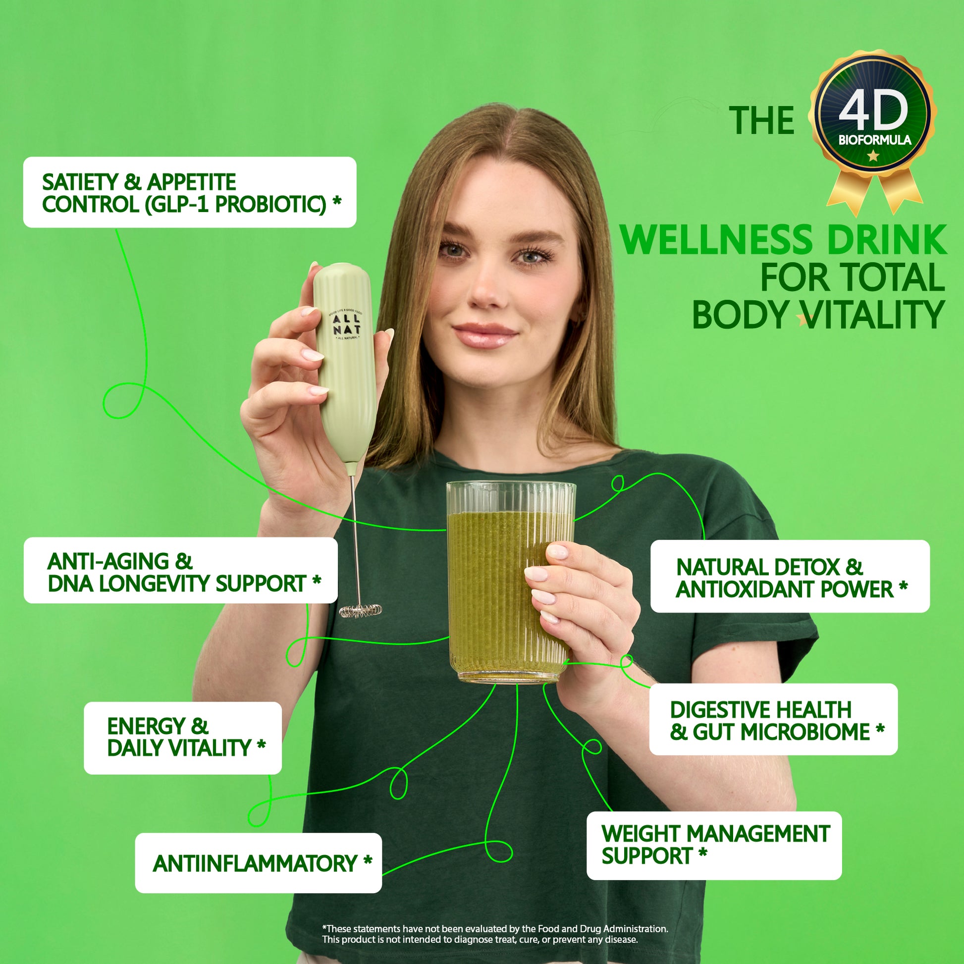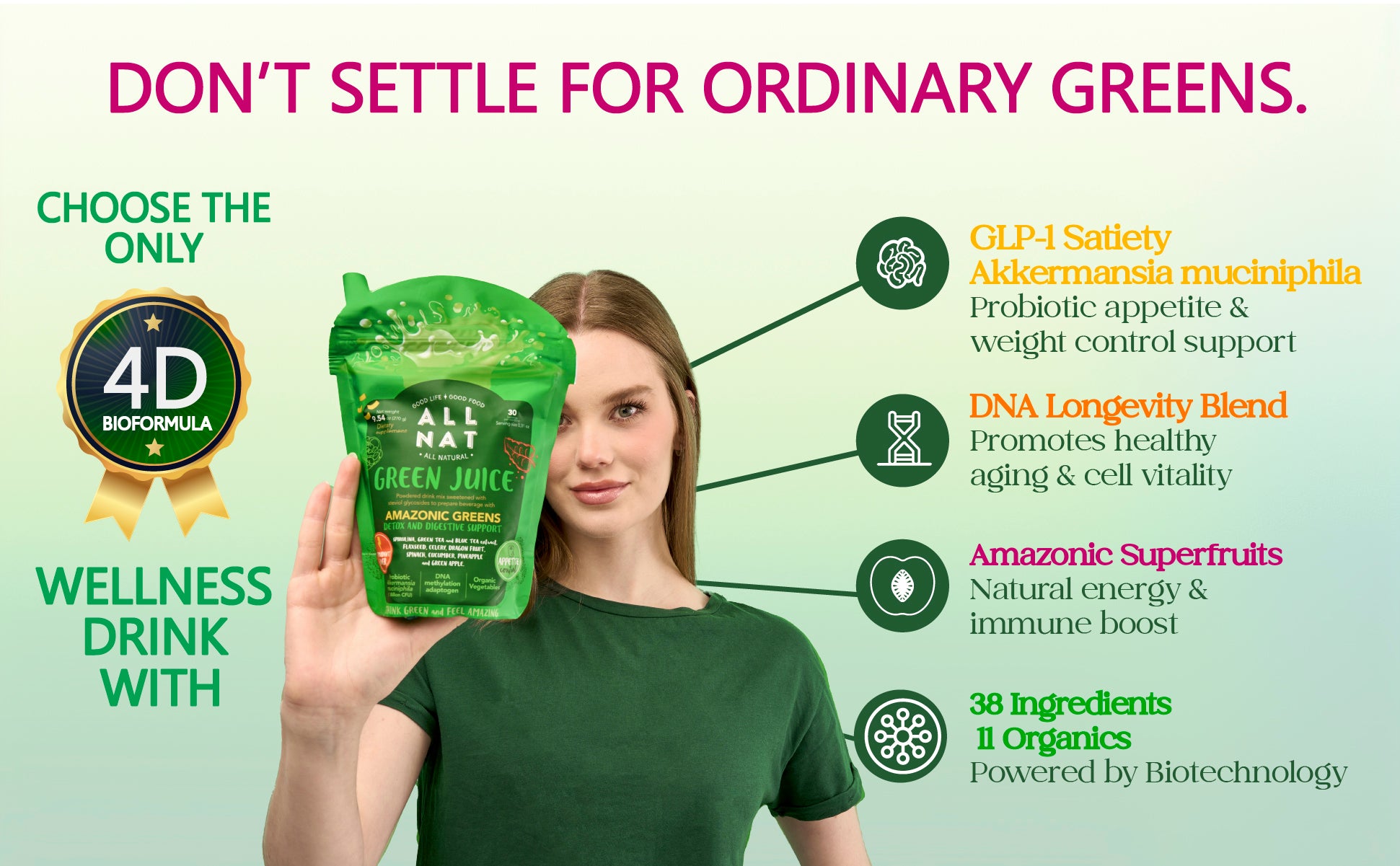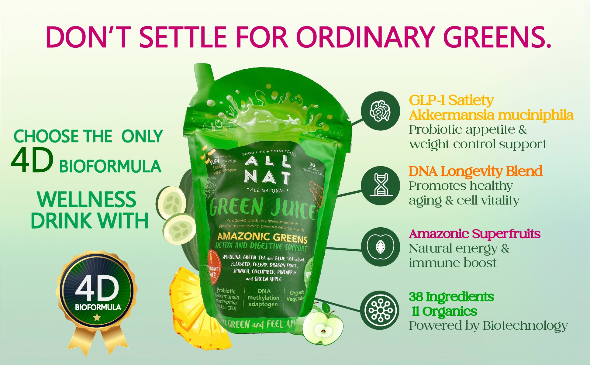 ALL NAT Super Greens Powder | 4D Bioformula Wellness Drink with 38 Superfoods & 11 Organic Nutrients | GLP-1 Probiotic (Akkermansia) for Gut & Weight Support | DNA Longevity Blend + Amazonian Antioxidants | Vegan · No Sugar · 30 Servings