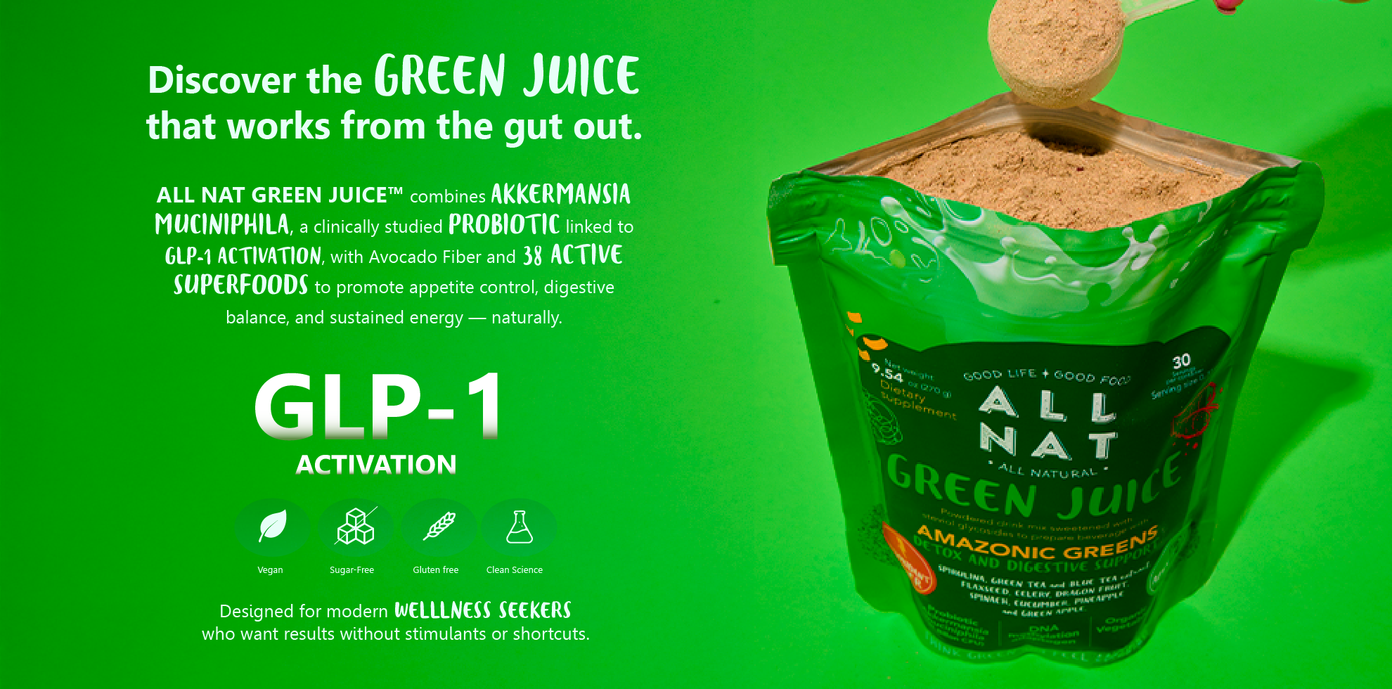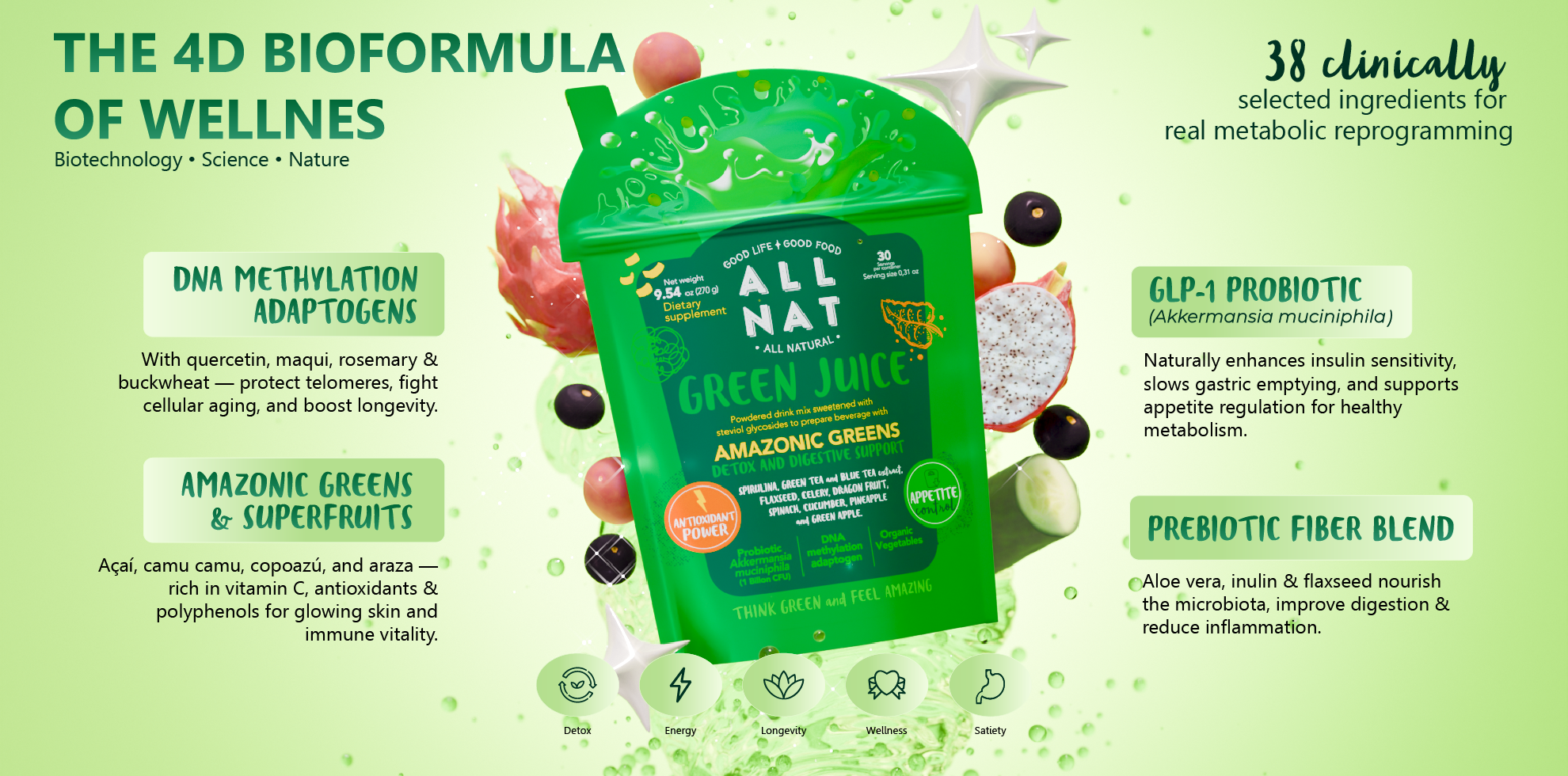 ALL NAT Green Juice is a 4D Bioformula Wellness Drink with 38 super-ingredients — including Amazonian superfruits, adaptogens, fiber blends, and next-gen probiotics like Akkermansia muciniphila.